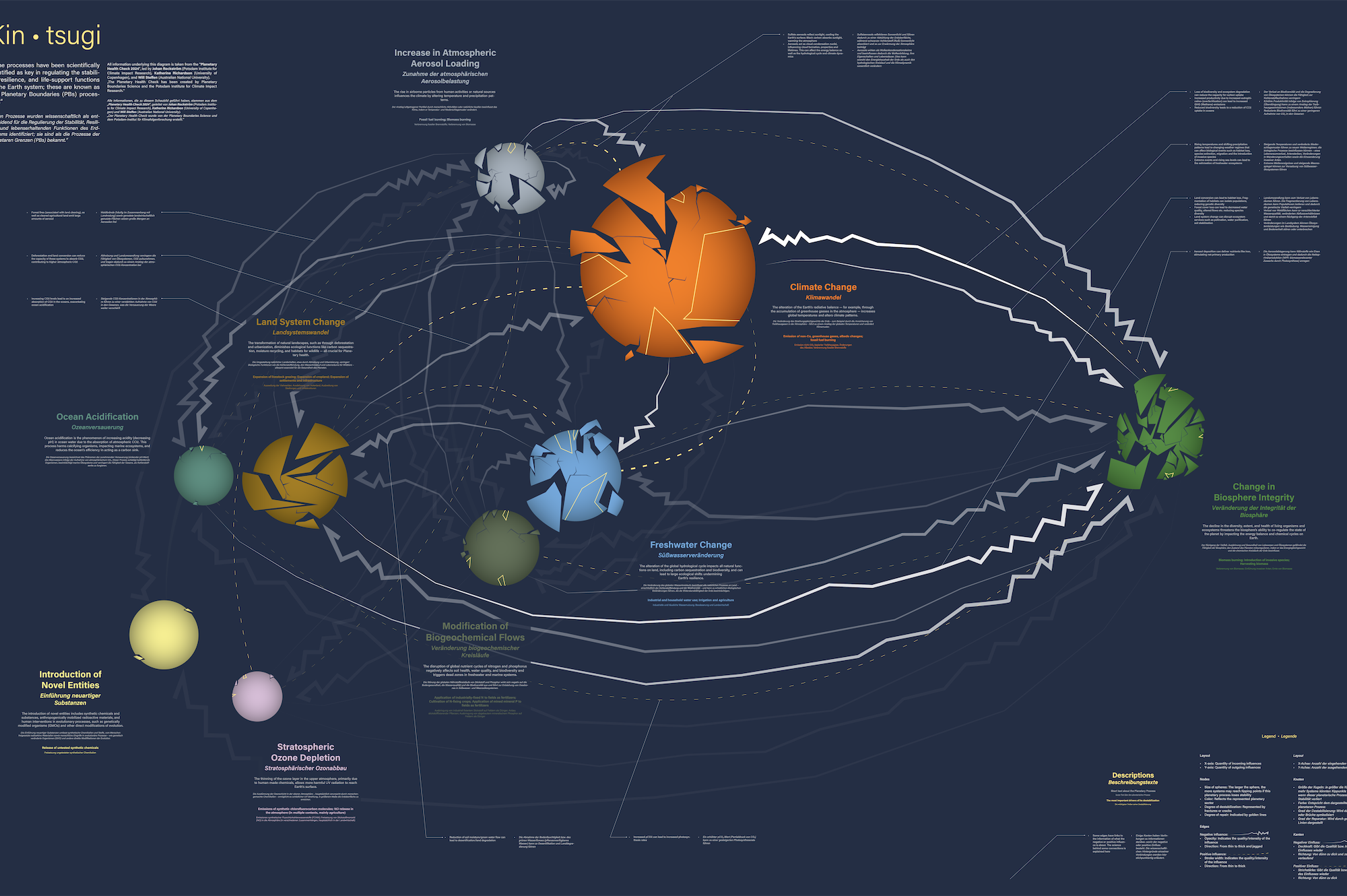 Kin.tsugi ist die grafische Auseinandersetzung mit dem Planetary Health Check Report von 2024. Inspiriert dazu wurde ich durch die Dokumentation Breaking Boundaries von 2021, in der die Theorie