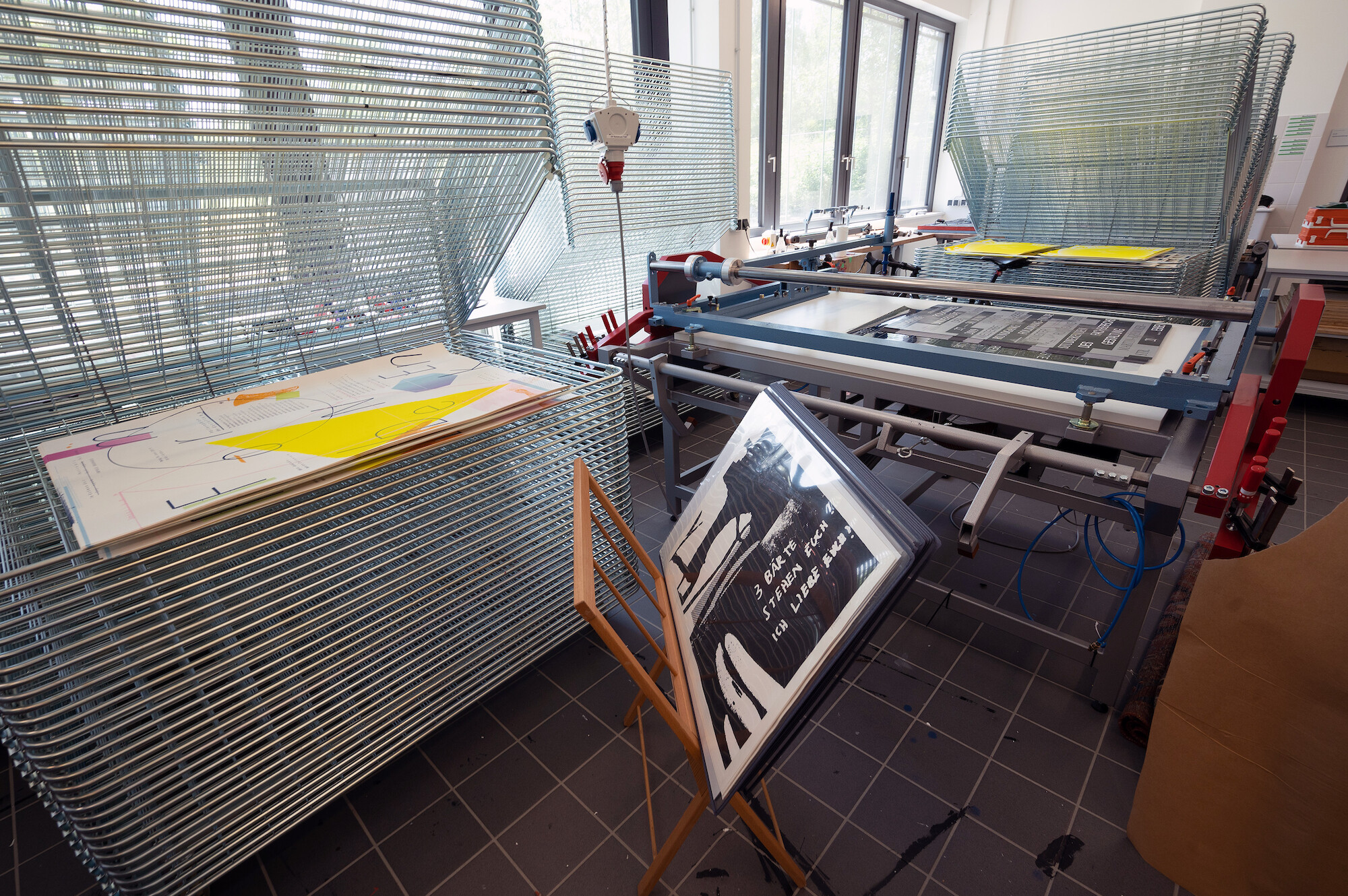 In der Siebdruckwerkstatt wird in erster Linie mit wasserbasierter Farbe auf Papier gedruckt. Experimente sind willkommen. Die freie und angewandte Arbeit mit dem künstlerischen Ausdrucksmedium Siebdruck dient auch dazu, ein Grundverständnis von ganzheitlichen Gestaltungsprozessen zu erlernen. Daher werden die Geräte soweit wie möglich von den Studierenden selbst bedient.