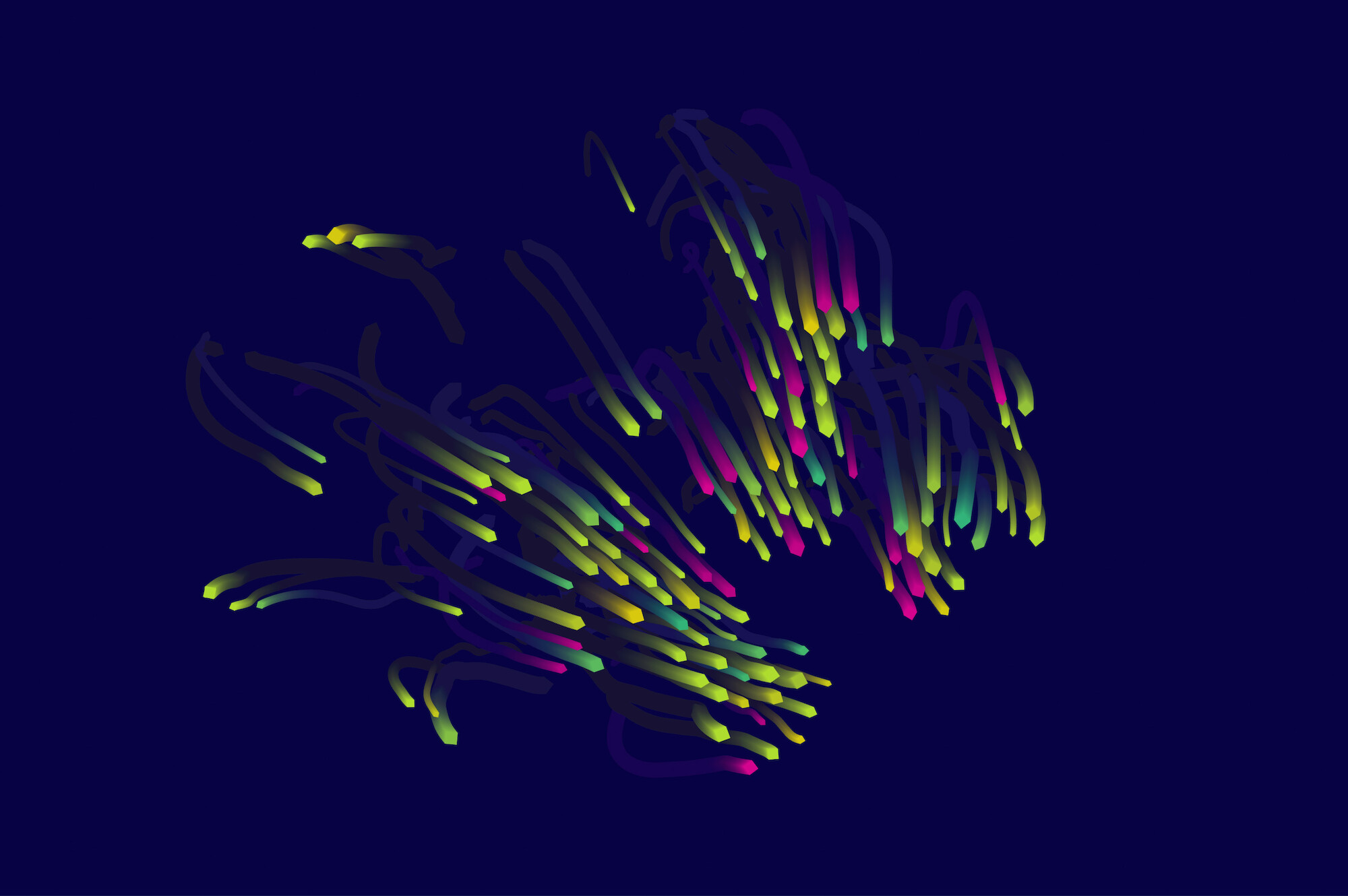 Die Partikel starten an einer zufälligen Positionen am linken Bildrand und wandern durch das Netzwerk. Dafür suchen sie sich basierend auf einem gewichteten Zufallsprinzip in jeder Ebene ein ›Neuron‹, welches sie als nächstes ansteuern.