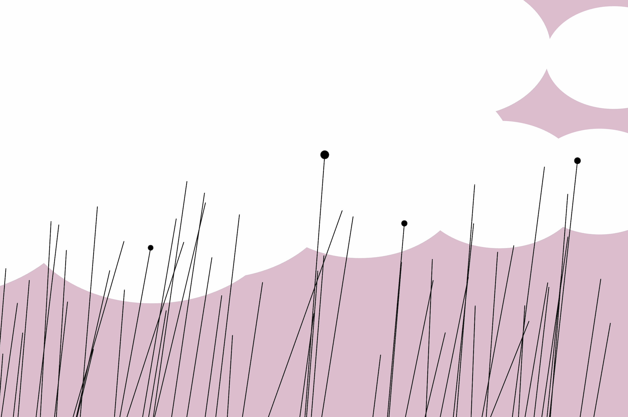 Der zweite Sketch ist eine einfache Interaktion von Wind und Pflanzen. Beim Wind wollte ich ein physisches Gefühl erzeugen, so dass man am Wind dreht wie an einem Rad, das sich erst mit einiger Kraft in Bewegung setzt und auch noch nach dem Loslassen weiter läuft. Das Aussehen des Grases durchlief mehrere Evolutionen von Strichstärken und Verzierungen, bis ich bei der jetzigen Form angelangt bin. Der Ton sollte auf ähnlich minimalistische Methoden zurückgreifen wie das Bild, andererseits sollte er immer noch das Essentielle vom ›Wind‹ beinhalten. In meiner Umsetzung gibt es zwei rauschende Töne, die sich überlagern und zu unterschiedlichen Anteilen proportional zur Windgeschwindigkeit verändern.