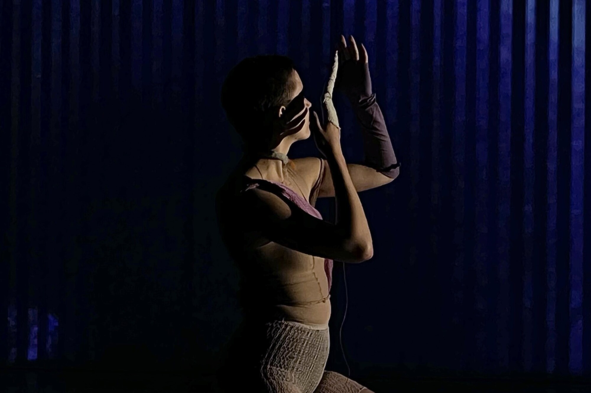 What new possibilities of expression arise for performers when their bodies merge with technology? My intermedial project »Textile Bodies« explores this through experimental, interdisciplinary performances. I hand knit costume parts which function as textile sensors through the incorporation of conductive yarns and materials. This allows these textiles to respond to electrical signals of movement and touch. Thus, performers are empowered to extend their range of expression to a visual and an auditory layer by being connected to synthesizers. As a result, new, non- verbal levels of communication become possible and form a multidimen- sional stage design. performed at Visiodrom in July of 2022
